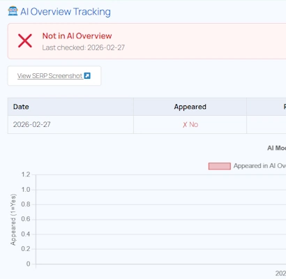Find out whether your brand is appearing in Google’s AI Overviews, with daily tracking and a score history so you can see how your visibility is trending over time.