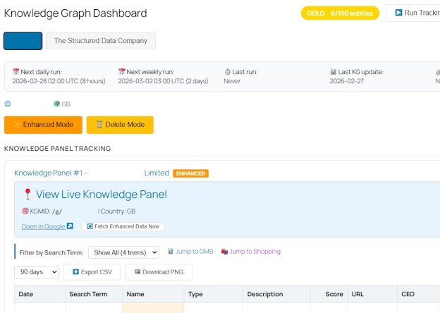 Track your Knowledge Graph presence with daily relevancy scores, monitor multiple entities per panel, analyse domain categories, and follow brand sentiment and mentions — all in one dashboard. You can even keep tabs on your Google Business Profile and Shopping Merchant panel too.